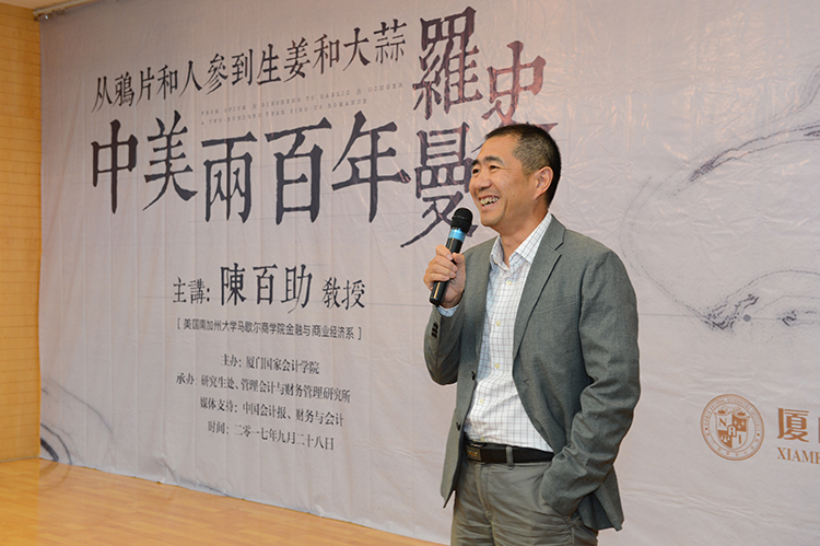 9月28日晚,厦门国家会计学院大型财经系列讲座“云顶讲坛”第九期在教学楼106教室举行。讲座邀请了美国南加州大学马歇尔商学院金融与商业经济系教授、全球EMBA项目学术主任陈百助博士带来题为《从鸦片和人参到生姜和大蒜:中美两百年的罗曼史》的讲演。讲坛由研究生处、管理会计与财务管理研究所联合承办,吸引了学院研究生和在我院参加培训的人大代表、中注协学员等校内外人士共近300人参加。讲坛同时开通了远程在线直播,并开展了线上线下热烈讨论,取得了良好的互动效果。