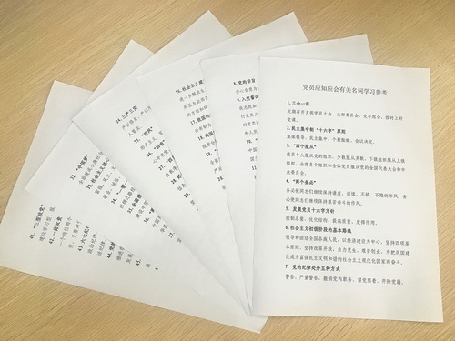 测试每月进行1次,共3次,内容是党员应知应会的有关名词。测试采取随机抽选5个名词进行闭卷考试的形式,分支部进行,旨在进一步提高全体党员政治理论学习的积极性和主动性,促进党员干部对党的应知应会知识入脑入心,实现以考促学、以学促改、以改促进的目的。