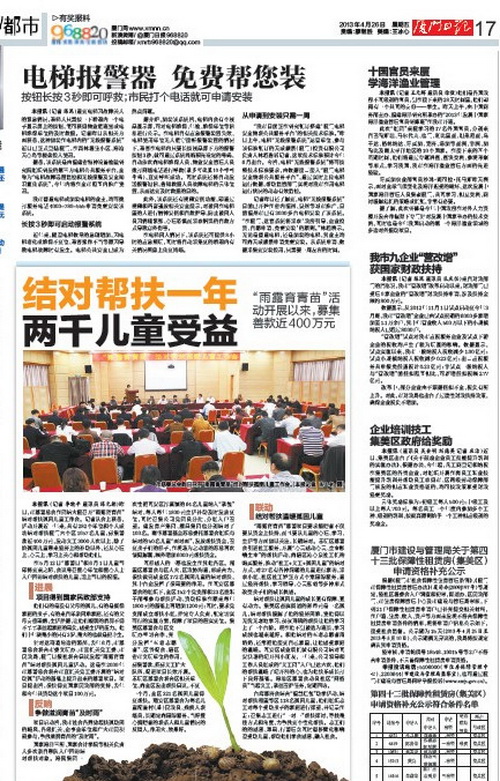 2013年4月25日上午,由市委文明办、市直机关党工委、市民政局、厦门日报社、市慈善总会联合发起的“雨露育青苗”结对帮扶孤困儿童慈善项目工作会在厦门团结大厦一楼会议厅举行。