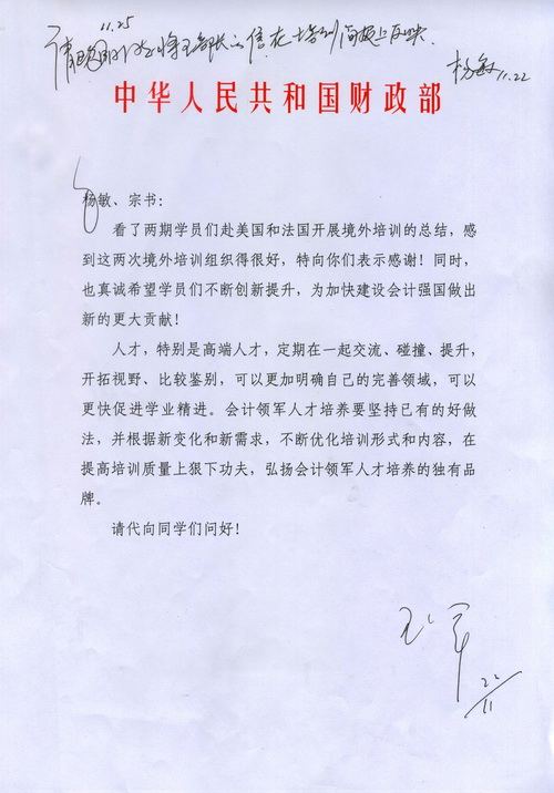 培训结束回国后,李国正同学、周瑞同学、池昭梅同学分别向财政部会计司提交了三篇培训报告《赴法国培训总结报告》、《法国财政预算管理研究及对我国财政预算管理的启示》、《法国应对欧债危机的措施及启示》。王军副部长非常关心领军班学员的每一期培训,通过学员们提交的培训简报和总结报告深入了解大家的学习生活和思想动态,这次又在百忙之中抽空认真阅读了学员们提交的培训总结和专题报告后,做出了饱含期望的批示。(通讯员:万琼)