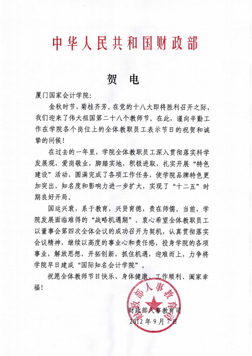 在第二十八个教师节即将来临之际,财政部人事教育司向我院发来贺电,向全体教职员工致以节日的祝贺和诚挚的问候。
