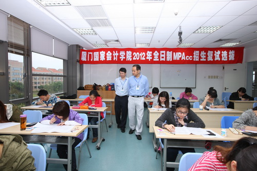 4月15日至17日,厦门国家会计学院2012年全日制会计硕士专业学位(MPAcc)招生复试工作在学院举行。本次报考我院的考生共有132名考生超过国家分数线,学院按照1:1.5的差额比例确定了复试名单。此次招生复试内容包括资格审查、复试动员、专业课笔试、外语以及思想政治理论与综合能力面试、体检等环节。