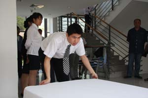 参加比赛的既有来自职业学校的实习生,也有在今年南平地区旅游中专技能摆台比赛获奖的技术能手。既有预赛成绩一般,决赛中超水平发挥的“黑马”,也有预赛成绩很好,决赛临场发挥失常的现象。通过比赛,还暴露出一些平常不易发现的问题,比如部分员工餐桌的主位花折叠的高度不够突出,客房床单抛单不到位,折角不够整齐等。