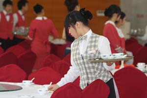 此次竞赛共设客房中式铺床、中餐宴会摆台和厨艺三个项目,并制定了详细的竞赛细则和考评表。“三百六十行,行行出状元”,参赛选手个个精神抖擞,以高昂的热情投入到比赛中,他们所展示出的娴熟技艺让比赛过程显得极为精彩。在中式铺床比赛中,甩单、包角、套被芯、套枕头,整套动作如行云流水、一气呵成,让观众大为喝彩;在中餐宴会摆台比赛中,严格按照五星级酒店的标准进行,选手们台布一次定位,餐具、饮具摆放得整齐、讲究,餐巾花折叠得造型各异,斟酒时姿势协调优雅,令人叹为观止;在厨艺比赛中,现场嘈嘈切切,有条不紊,选手们将土豆、胡萝卜、肉切成火柴杆般大小的细丝,粗细均匀,长短相等,真是让人大饱眼福。