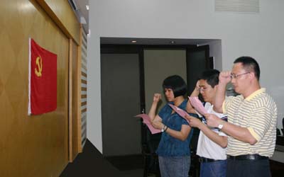 大会首先举行了新党员入党宣誓仪式。在党委委员王一平的带领下,吴岚岚、林学颖两位新党员面朝鲜艳的党旗庄严地举起右手向党旗宣誓:我志愿加入中国共产党……宣誓完毕后,党委书记张军在接下来的讲话中对新党员提出了要求,他希望今天参加入党宣誓的两位新党员,要牢记入党誓言,忠实践行“三个代表”重要思想,坚定共产党员的政治信念,用党员的标准要求自己,在以后的工作实践中兑现自己入党时的诺言。