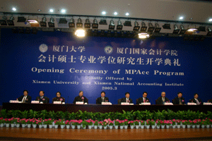 2005年3月25日下午,首届厦门大学与厦门国家会计学院联合培养会计专业硕士学位研究生班(MPAcc)开学典礼在我院学术报告厅隆重举行。财政部党组成员、部长助理王军、厦门大学校长朱崇实教授、厦门国家会计学院院长邓力平教授、我国著名会计学家葛家澍教授、常勋教授、财政部人事教育司巡视员苏金秀、人事教育司干教处处长邵诗利、我院副院长黄世忠教授、厦门大学管理学院院长翁君奕教授、厦门大学会计发展研究中心主任曲晓辉教授等出席开学典礼。开学典礼由MPAcc中心联合主任陈汉文教授主持。