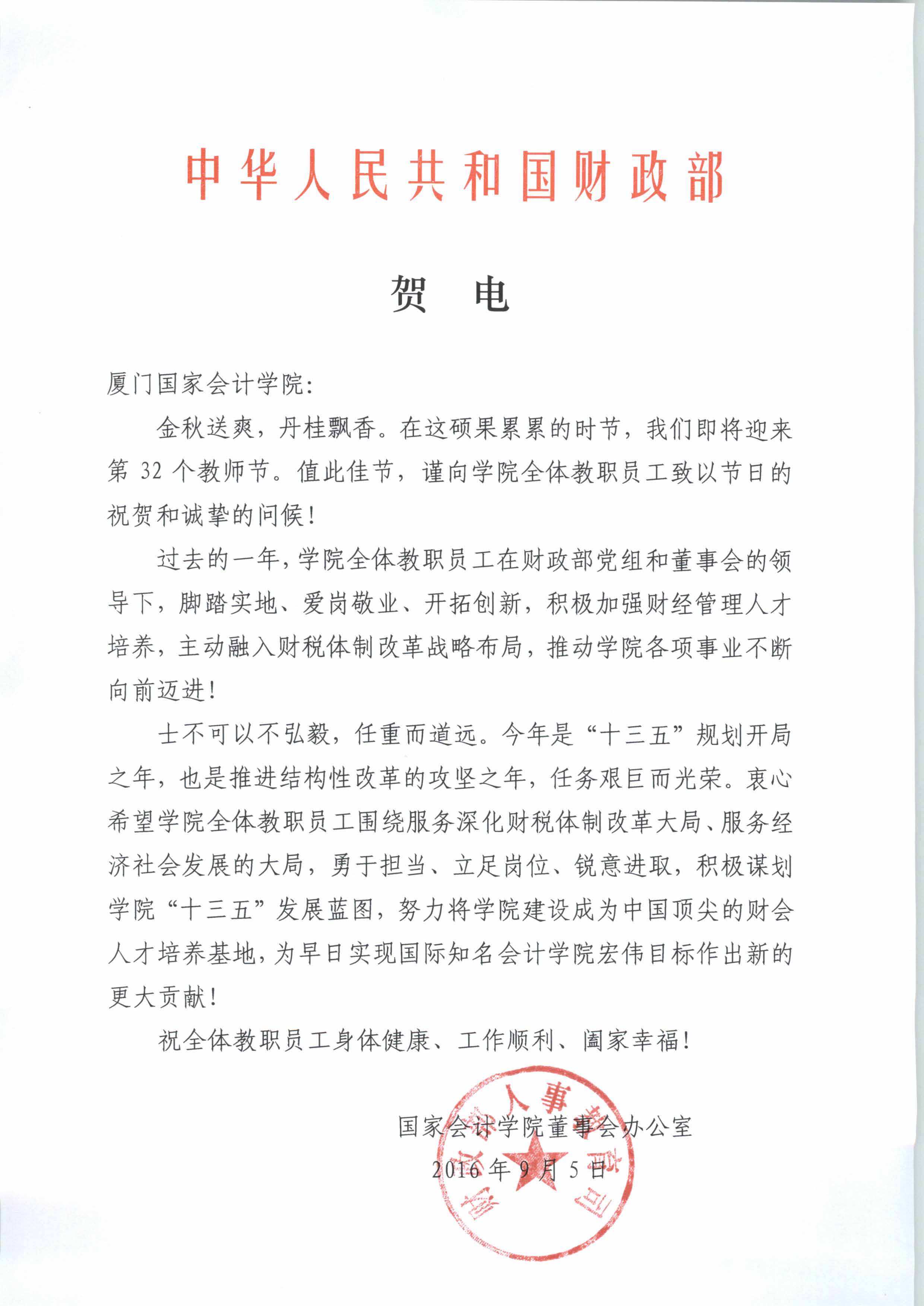 在第32个教师节即将来临之际,财政部人事教育司、国家会计学院董事会办公室发来贺电,向学院全体教职员工致以节日的祝贺和诚挚的问候。祝全体教职员工身体健康、工作顺利、阖家幸福!