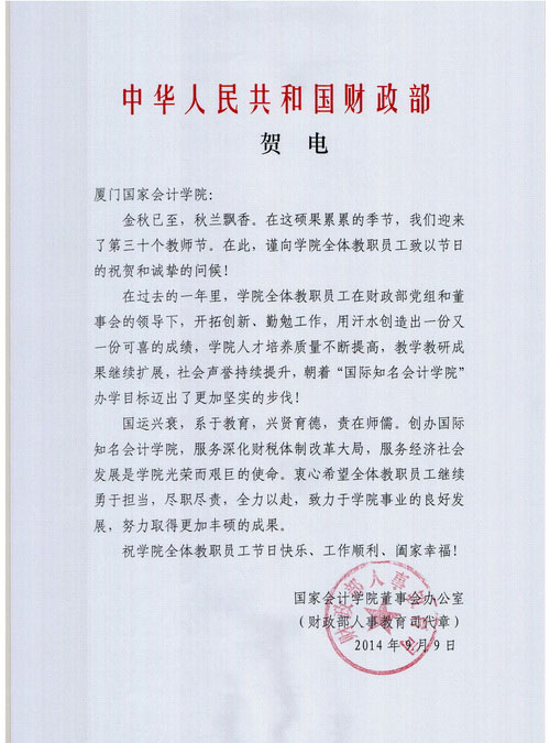 在第三十个教师节即将来临之际,财政部人事教育司发来贺电,向学院全体教职员工致以节日的祝贺和诚挚的问候!