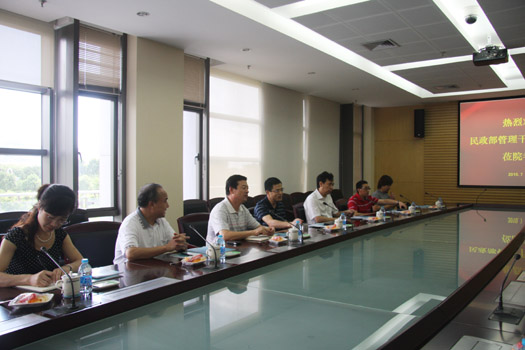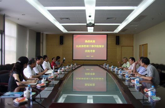 7月21日,民政部管理干部学院院长蒋昆生、党委书记王杰秀、副院长梅玉保等一行8人莅临我院参观考察。我院党委书记张军、副院长李海滨会见了客人,办公室主任沈毅、后勤管理处处长李进西等陪同参加了座谈。
