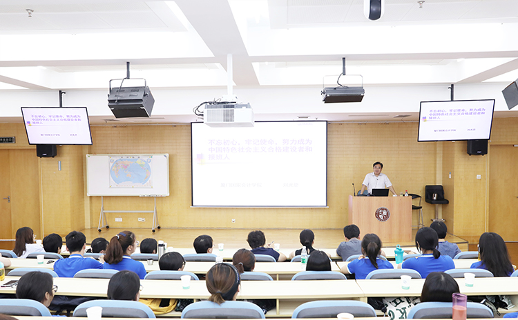 9月2日,厦门国家会计学院2019学年新学期正式开启。为帮助研究生新生更好地适应学院的学习生活,在新起点上迈好第一步,学院党委书记刘光忠以“不忘初心,牢记使命,努力成为中国特色社会主义合格建设者和接班人”为主题,为2019级新生开讲研究生生涯的第一堂思想政治理论课。“第一课”由学院党委委员、院长助理黄京菁主持,研究生处全体教职工与100名新生共同聆听了党课。
