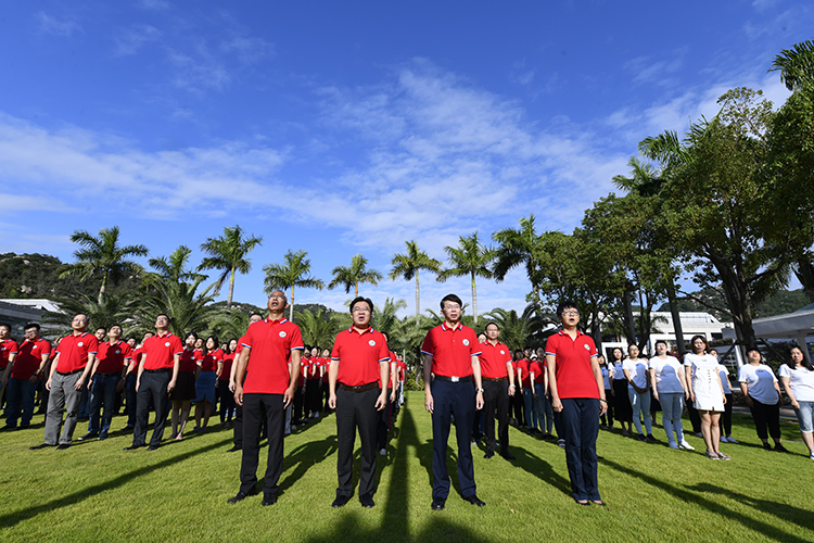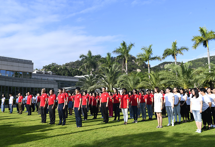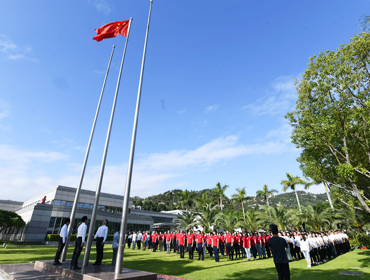 上午8时整,由三名研究生担任的国旗手迈着铿锵有力的步伐,护卫着鲜艳的国旗来到旗杆下。在雄壮的中华人民共和国国歌声中,五星红旗冉冉升起,全体人员肃立、行注目礼并高唱国歌。