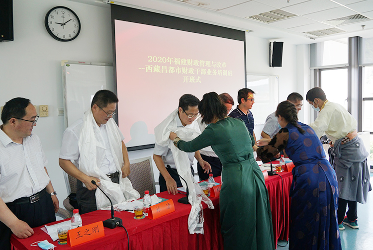 开班式上,昌都市财政局代表为财政厅和学院的各位领导敬献洁白的哈达,表达衷心感谢之情。