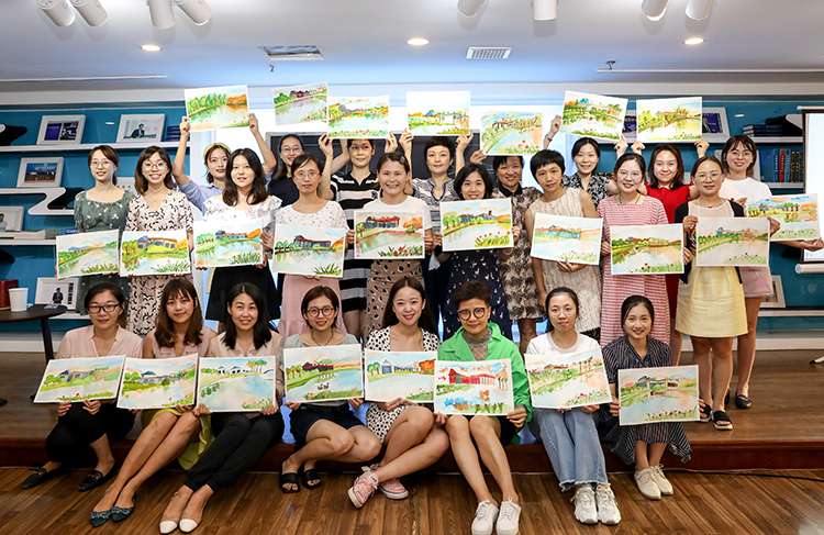 随后,在专业老师的悉心指导下,大家对绘画方法、基本工具使用、画面控制等知识都有所领悟后,纷纷拿起画笔,全身心地投入到作品创作中去,尽情领略着艺术所带来的独特魅力。同一处学院风景,职工们带着各自不同的认识和体会,经过两个小时的认真创作,一张张独一无二的作品跃然呈现。现场一片欢声笑语,大家不时拿起手机,定格下珍贵的瞬间。大家在轻松愉悦的氛围中全身心零距离地感受艺术之美、生活之美。