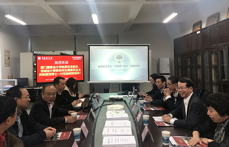 重庆理工大学会计学院副院长程平教授从会计学科建设、会计信息化能力建设、MPAcc综合改革顶层设计、MPAcc教育实践等四个方面对于重庆理工大学“互联网+会计”的MPAcc教育改革作了详细的介绍,双方就师资培养、核心课程的课程体系和教学模式改革等进行深入交流。黄世忠院长一行还参观了《会计大数据基础》课程教学平台和“RPA+AI”财务与审计机器人实验教学示范中心。