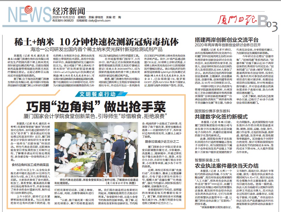 10月22日《厦门日报》第B03版(经济新闻)刊发了题为《巧用“边角料”做出抢手菜——厦门国家会计学院食堂创新菜色,引导学生“珍惜粮食,拒绝浪费”》的通讯报道。文章从我院师生“后厨体验”活动入手,将学院自“厉行节约 反对浪费”活动开展以来系列举措和良好成效均进行了深入报道。