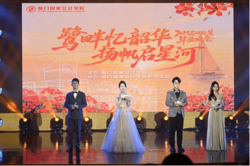 6月26日晚,厦门国家会计学院2025届“鹭畔忆韶华,扬帆启星河”研究生毕业晚会在掌声中拉开帷幕。厦门国家会计学院党委副书记、院长丁友刚,党委委员、副院长李进西,党委委员、纪委书记潘连众,党委委员、副院长邓建平莅临本次晚会现场,与研究生处师生、学院教职员工、在校培训学员、学生家长共同观看了这场精彩演出。晚会由2022级会计班黄梦君、2022级会计班张桐、2022级税务班虞雯静、2022级审计班谭传兴担任主持人。