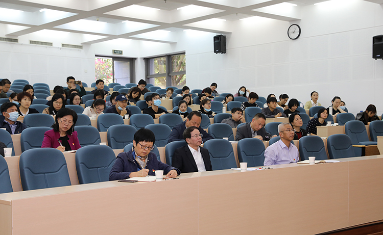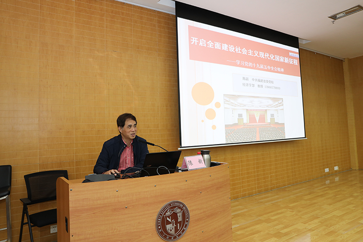 根据学院党委部署安排,12月7日上午,学院召开党委理论学习中心组(扩大)会议暨传达学习党的十九届五中全会精神专题辅导报告会,邀请福建省委党校(福建省行政学院)经济学教研部副主任、省高校政治理论课特聘教授、省委宣传部首批福建理论宣讲专家陈新教授,为我们讲述“开启全面建设社会主义现代化国家新征程”的主题报告。学院院长黄世忠,学院党委委员、副院长李进西,党委委员、副院长黄京菁和全体教职员工一起聆听了报告。报告会由李进西同志主持。