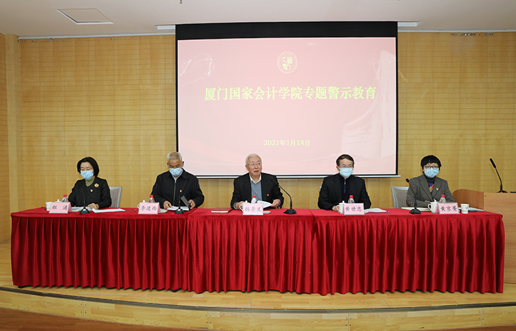 2021年1月14日上午,学院召开专题警示教育大会。会议由学院党委书记韩景义主持,院长黄世忠,党委委员、副院长李进西,党委委员、副院长黄京菁,党委委员、纪委书记、副院长郑涌和全体教职员工参加了会议。