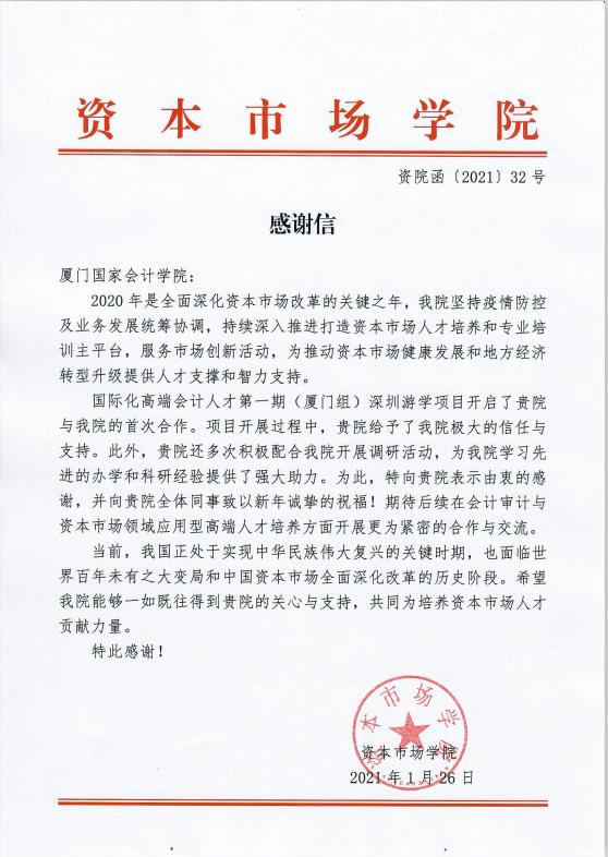 近日,资本市场学院向我院发来感谢信,感谢我院在国际化高端会计人才第一期(厦门组)深圳游学项目中给予的信任、配合与支持。