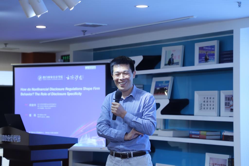 4月19日下午,云顶沙龙第56期邀请厦门大学财务管理与会计研究院副院长胡金帅副教授分享他的工作论文:“How do Nonfinancial Disclosure Regulations Shape Firm Behavior? The Role of Disclosure Specificity。本期沙龙由厦门国家会计学院教研中心、财务会计与审计研究所承办,教研中心副主任蹇薇副教授主持沙龙,学院部分教师、学员、研究生等到场参与讨论。