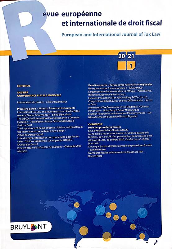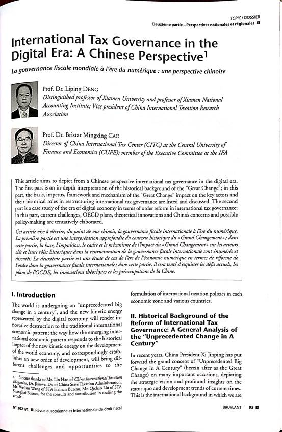 近期邓力平教授以第一作者身份在《欧盟与国际税法季刊》(Revue Europeenne et internationale de droit fiscal)国际学术期刊上发表论文《International Tax Governance in the Digital Era: A Chinese Perspective》,论文合作作者为中央财经大学教授曹明星。论文以百年未有之大变局的理念来谋划国际税收合作的方向,力图达到传递中国声音,阐释中国在国际税收合作立场的目标。