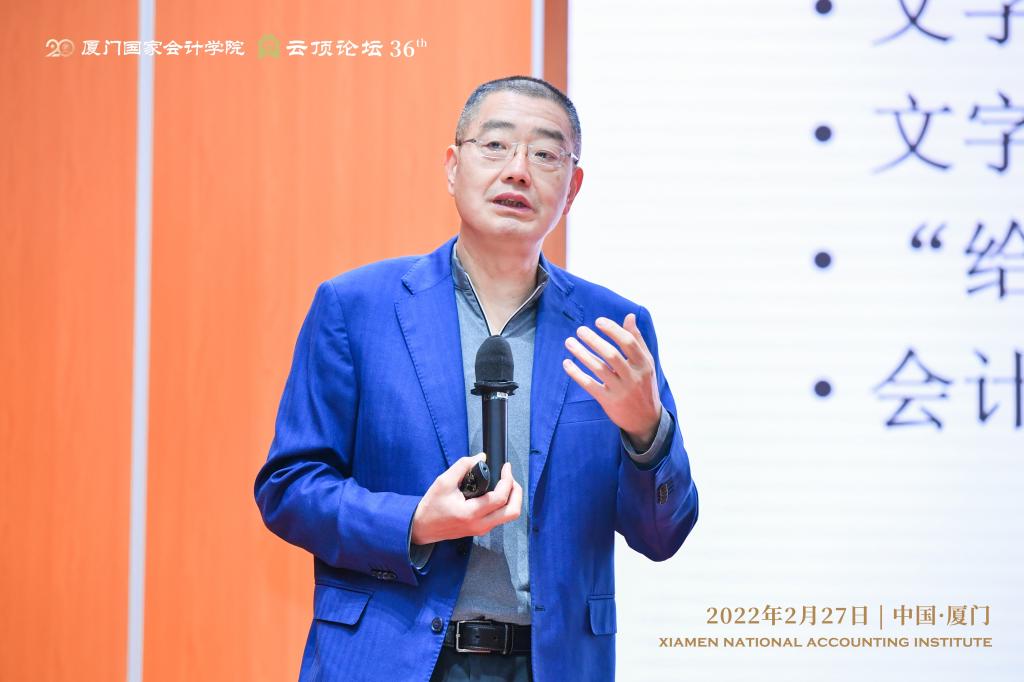 刘峰教授做主题为“会计的意义”的主旨演讲。刘教授首先介绍了会计与文字的关系,通过阐述人类文明史中文字的发明动因,提出会计推动了人类创造文字;其次,他将话题延伸,讲述了会计与资本的关系,强调会计对社会经济发展的重要性;接着,他分析了会计与信任的关系,通过对比历史中联姻、交换人质、财产抵押等解决信任的方式,突显会计对解决信任问题的低成本、可复制、可推广及全覆盖性,引伸出会计的普遍意义;最后,他提出会计与个人的关系,通过运用达尔文演化论,论证了人类身上拥有的会计基因,号召大家充分发挥会计思维,从人类发展的宏伟历程中肯定会计的价值。