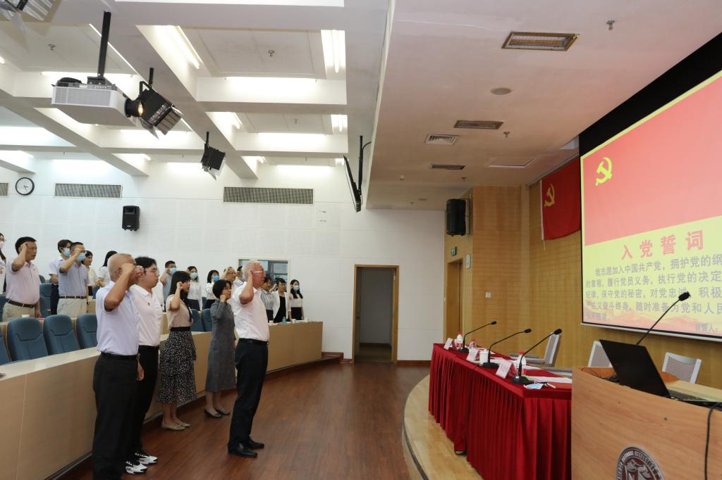 大会举行了新党员入党宣誓仪式。在韩景义同志的领誓下,今年新加入党组织的党员面对鲜红的党旗进行了庄严的入党宣誓。与会全体师生党员们也一同重温了入党誓词。
