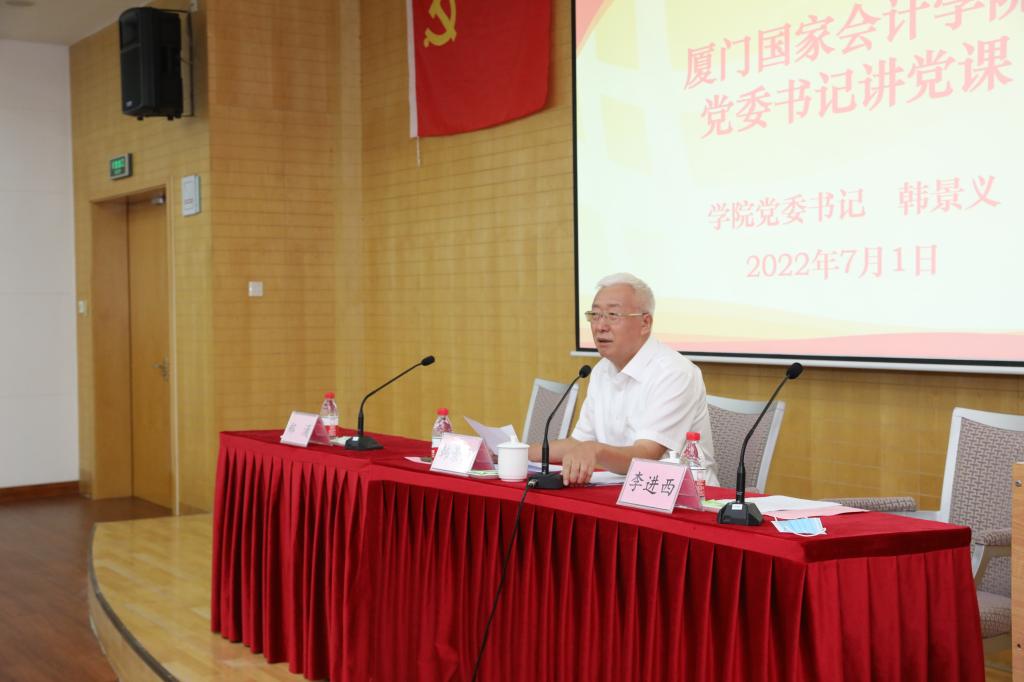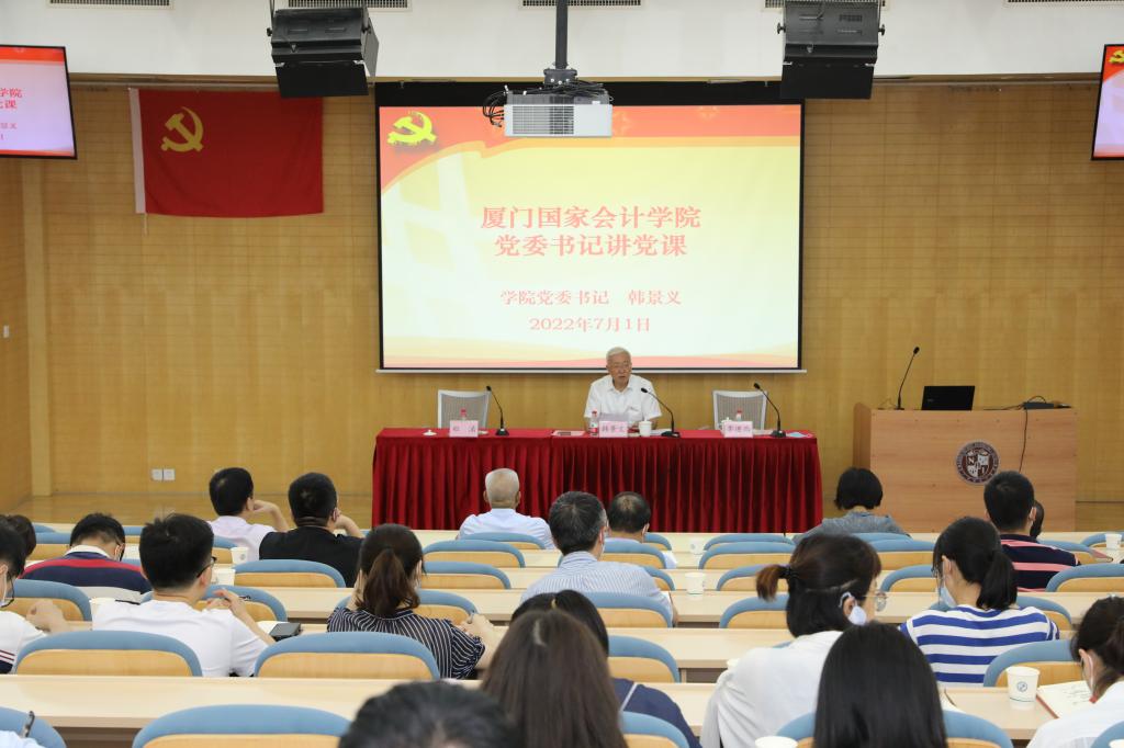 在庆祝中国共产党成立101周年之际,根据财政部党组、厦门市委有关部署要求,结合学院开展“廉洁文化建设年”和“2022年警示教育周”活动的有关安排,学院党委书记韩景义近日以“弘扬伟大精神,坚定理想信念,筑牢思想防线,扎实推进学院高质量发展”为题,为全院师生党员讲专题党课。学院党委领导班子成员、全体在校师生党员一同参加。