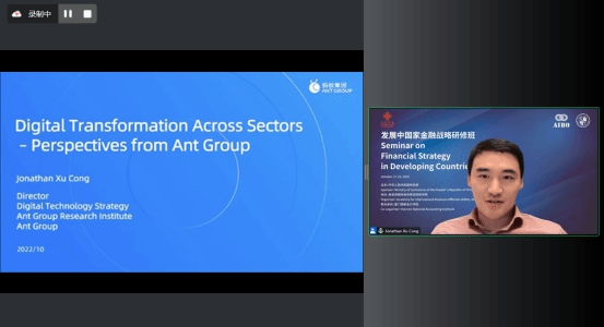 蚂蚁集团研究院数字科技高级战略规划专家徐枞从数字支付、数字服务、数字政府、数字金融、数字技术等方面介绍蚂蚁集团的数字化发展经验,并分享了蚂蚁集团走出国门,积极推动数字领域国际合作的主要案例。