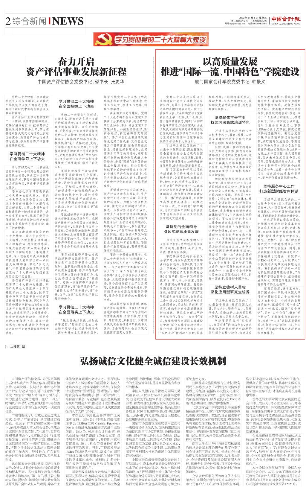 蓝图已绘就,奋斗正当时。厦门国家会计学院将把深入学习宣传贯彻党的二十大精神作为当前和今后一个时期的重要政治任务,深刻领悟“两个确立”的决定性意义,增强“四个意识”、坚定“四个自信”、做到“两个维护”,不断强化自身职能定位,推动“十四五”时期高质量发展,在努力开拓“国际一流、中国特色”学院建设过程中展现更大担当和作为。