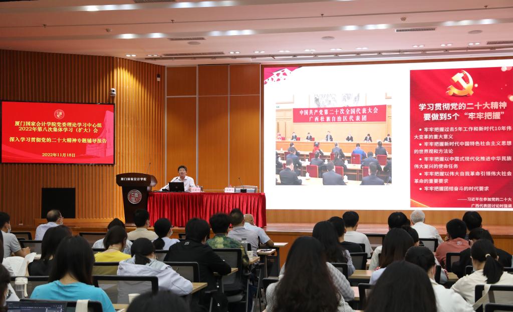 根据厦门国家会计学院学习宣传贯彻党的二十大精神工作方案安排,11月18日下午,学院举行党委理论学习中心组2022年第八次集体学习暨学院深入学习贯彻党的二十大精神专题辅导报告会,邀请学习贯彻党的二十大精神福建省委宣讲团成员、厦门大学党委副书记、厦门大学马克思主义学院院长徐进功教授作题为《坚定历史自信 增强历史主动 谱写新时代中国特色社会主义新篇章》的辅导报告。学院党委书记韩景义主持报告会,并对学习宣传贯彻党的二十大精神工作进行再动员再部署,学院领导班子成员李进西、郑涌和全院教职员工、全体在校研究生等共三百余人一同聆听报告。