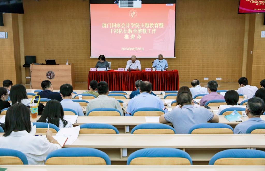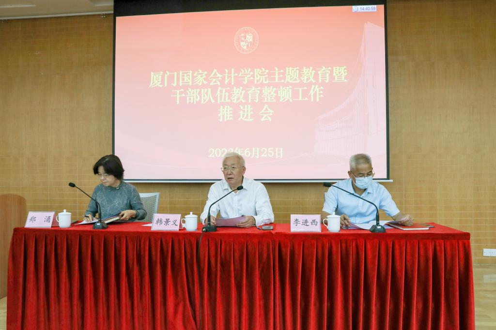 6月25日,厦门国家会计学院党委组织召开学习贯彻习近平新时代中国特色社会主义思想主题教育暨干部队伍教育整顿工作推进会,传达财政部有关会议精神,研究部署下一步重点工作。学院党委书记、主题教育工作领导小组组长韩景义主持会议并讲话。学院党委委员、副院长李进西,党委委员、纪委书记、副院长郑涌和全院党员、干部参加会议。