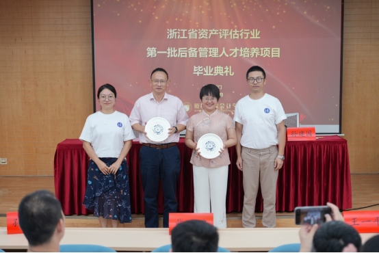 回首过往,第一届后备人才班同学取得了不凡的业绩,三年期间在荣誉奖励、服务经济,职务晋升等方面交出了亮丽的成绩单:三人被选举为中国资产评估协会第六届全国代表,二人为市、区级政协委员,十余人被评估省、市级优秀评估师;二十余人担任省、市级评审专家,二十余人职位有所晋升。这离不开浙江省评协和厦门国家会计学院为我们的付出,为表感谢,人才班专程为浙江省评估协会和厦门国家会计学院赠送了纪念圆盘,并邀请出席领导共同拍摄毕业留念。