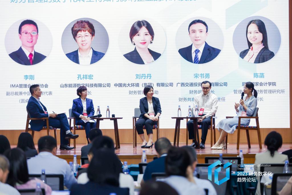 论坛最后,IMA副总裁兼中国区首席代表李刚先生作为圆桌主席主持了题为“财务管理的数字化转型将如何影响企业的未来发展?”的圆桌论坛。山东能源数字科技有限公司董事长孔祥宏女士,中国光大环境(集团)有限公司财务管理部总助刘丹丹女士,广西交通投资集团财务部副部长、财务共享服务中心副主任宋书勇先生和厦门国家会计学院管理会计与财务管理研究所所长陈菡副教授,一起分享在财务数字化转型方面的实践经验和思想感悟。