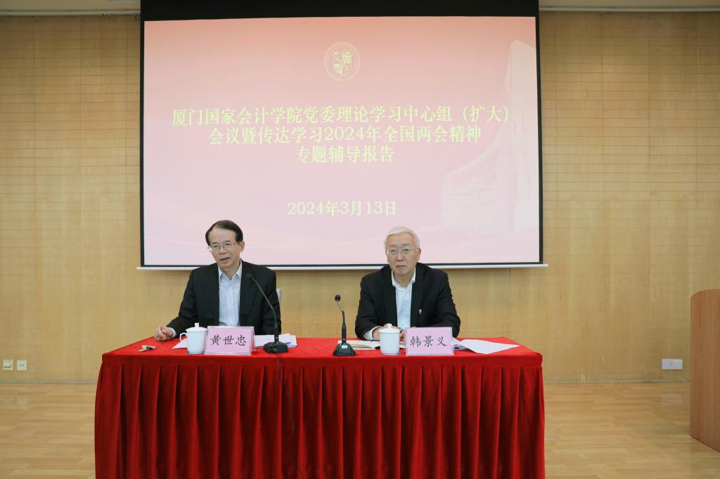 3月13日下午,厦门国家会计学院召开党委理论学习中心组集体学习(扩大)会议暨传达学习2024年全国两会精神专题辅导报告会,邀请十四届全国人大代表、学院黄世忠教授传达习近平总书记在全国两会上的重要讲话精神和全国两会精神。学院党委书记韩景义主持会议并讲话。学院党委领导班子成员丁友刚、李进西、郑涌、邓建平和全院教职员工参加集体学习。