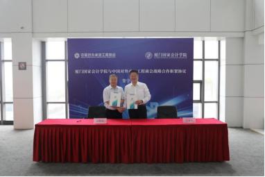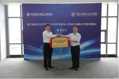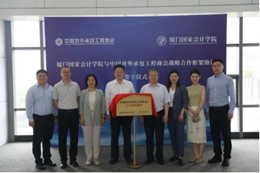 5月30日上午,厦门国家会计学院与中国对外承包工程商会(以下简称“承包商会”)签署战略合作协议,并举行“中国对外承包工程商会人才培训基地”揭牌仪式。双方就“一带一路”财经财会人员培养、国际财会组织合作、国际财经智库研究等多方面的合作开展座谈。承包商会会长房秋晨,学院党委副书记、副院长丁友刚,学院党委委员、纪委书记、副院长郑涌出席此次活动,仪式由郑涌主持,承包商会及学院相关人员参加本次签约(揭牌)仪式暨合作座谈会。