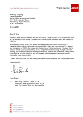 白容在感谢信中指出,作为战略合作伙伴,ACCA一直非常重视加强和厦门国家会计学院的合作。长期以来,厦门国家会计学院与ACCA共同致力于培养社会急需的财会高端人才,双方在高端培训、学位教育和智库建设等领域一直保持着良好的合作关系,多年来一系列的合作均取得了丰硕的成果。丁友刚在与会期间分享的关于高端人才培训、合作研究、共同开发新培训项目等新的合作建议具有重大的现实意义。未来,ACCA和学院将继续实现资源共享,为彼此的学员、会员搭建一个更加广阔的平台,共同促进财会行业的健康发展,非常期待能够进一步挖掘和学院多方位的合作模式,实现合作共赢。
