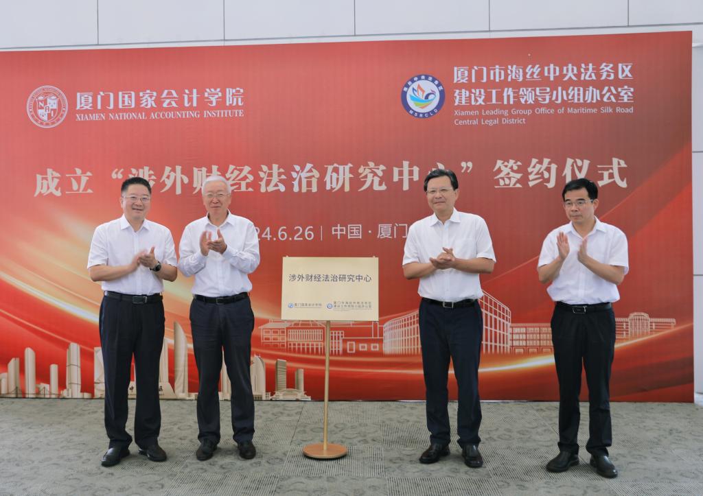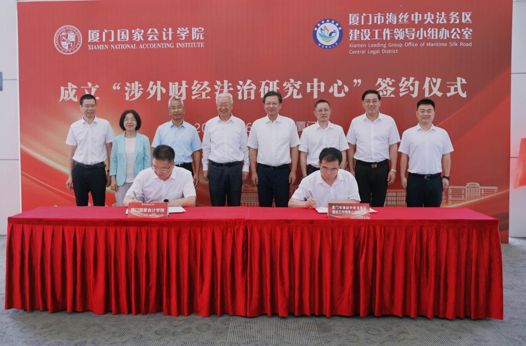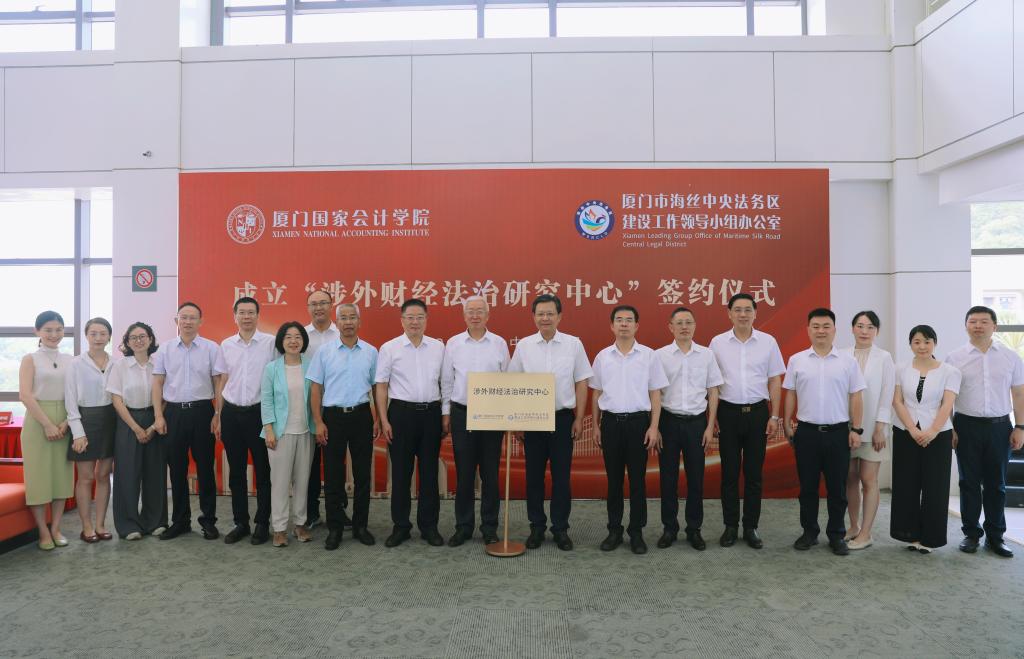 为推动共建“一带一路”高质量发展,6月26日上午,学院与厦门市海丝中央法务区建设工作领导小组办公室(以下简称“厦门市海丝法务办”)举行“涉外财经法治研究中心”签约暨揭牌仪式。双方将以该中心为抓手,通过课题研究、课程开发、活动组织、人才培养等方式,加强“一带一路”涉外财经和法律交流,助力中国企业“走出去”。厦门市委常委、政法委书记、厦门市海丝法务办主任李伟华,厦门市委政法委常务副书记、厦门市海丝法务办常务副主任黄平南,学院党委书记韩景义,学院党委副书记、副院长丁友刚,学院党委委员、副院长李进西,学院党委委员、纪委书记、副院长郑涌,学院党委委员、副院长邓建平出席此次活动,邓建平主持仪式。