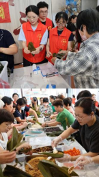 在包粽子教学与实践环节里,社区那些包粽子经验丰富的居民化身“老师”,现场示范粽叶的折叠、糯米的填充、粽子的捆绑等技巧和方法。志愿者们围在一旁,全神贯注地观看学习,其中部分志愿者更是跃跃欲试,亲自动手实践,社区居民们则在一旁耐心指导。志愿者和居民们分工明确、各展其能、彼此配合默契,共同完成了包粽子的任务。