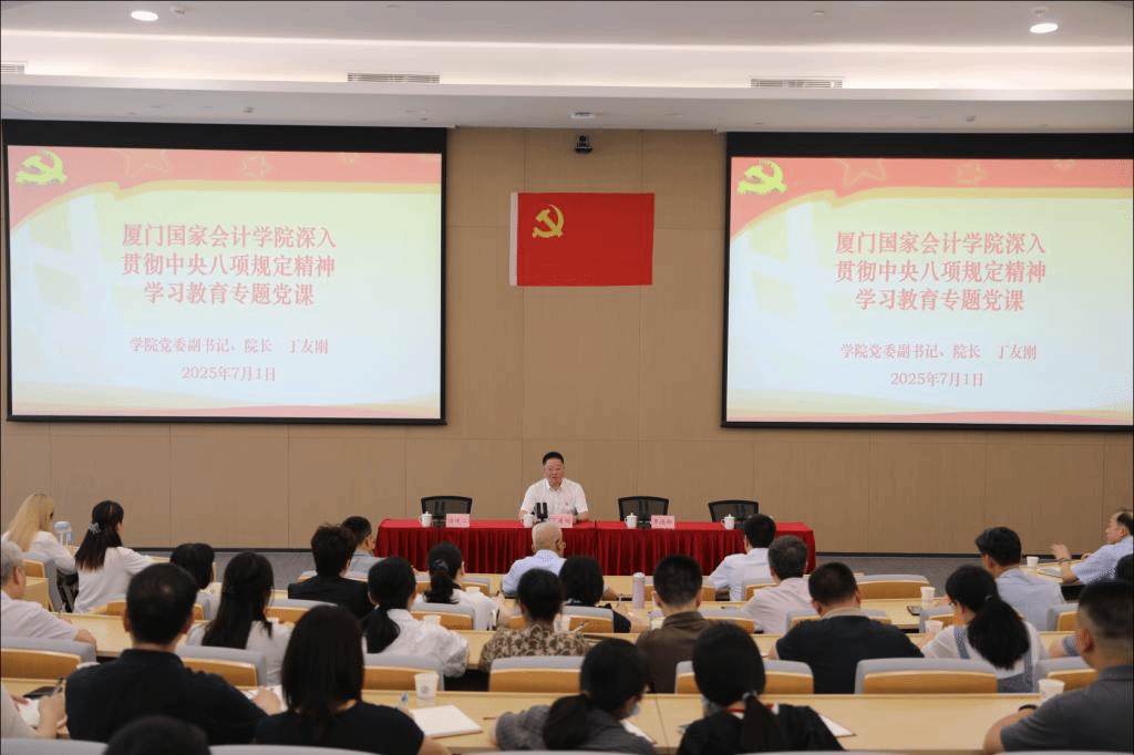 为庆祝中国共产党成立104周年,推进深入贯彻中央八项规定精神学习教育走深走实,不断加强党组织的凝聚力和战斗力,7月1日上午,厦门国家会计学院隆重举行庆祝中国共产党成立104周年大会。学院党委副书记、院长丁友刚出席会议并并为全体党员讲授深入贯彻中央八项规定精神学习教育专题党课,党委委员、副院长李进西主持会议,党委领导班子成员、全体师生党员及入党积极分子等参加会议。