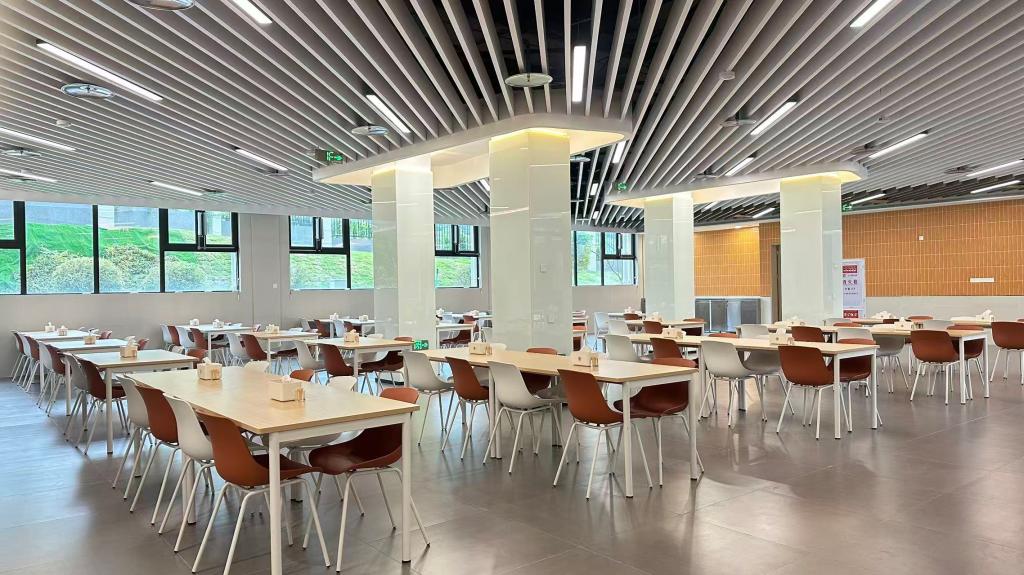 餐厅装修延续研究生综合用房整体设计风格,顶部采用金属格栅吊顶,搭配线性灯带,增强空间层次感的同时营造出明亮柔和的光线效果;墙面融合浅灰与暖棕色调,搭配橙白相间的餐桌椅,营造温馨宜人的就餐环境。