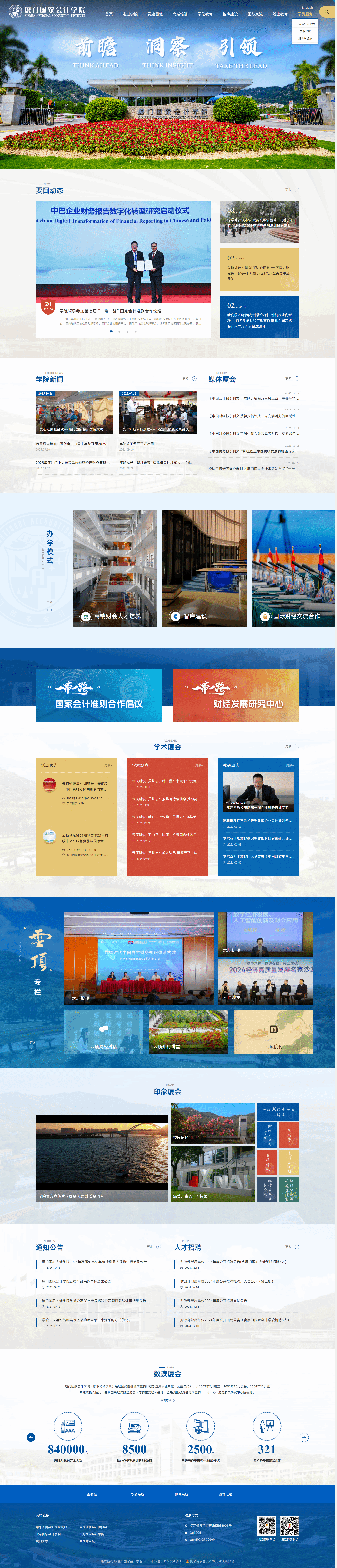 新版官方网站以深蓝色为主色调,这抹兼具沉稳底蕴与生命活力的色彩,既是学院精神的视觉凝练,也让每一次浏览都浸润着“厦国会情怀”;全新轮播主页大屏焕新亮相,校园风景融入全面展示学院校训、办学目标及办学理念,增强视觉冲击力;整体页面设计深度植入学院特色元素,让校园地标成为记忆锚点;模块化页面布局清晰,吸顶式栏目操作流畅,让网站不仅是信息载体,更成为传递学校文化底蕴与精神风貌的“移动校园”。