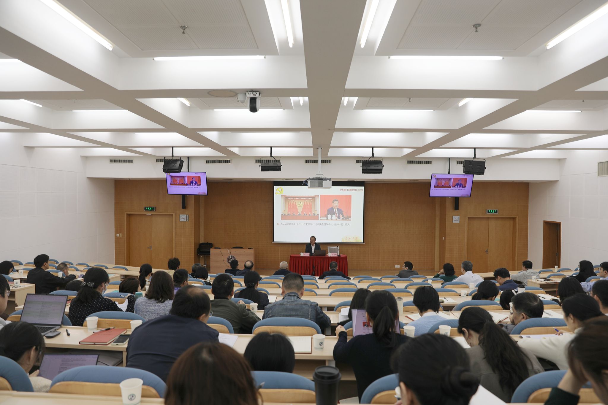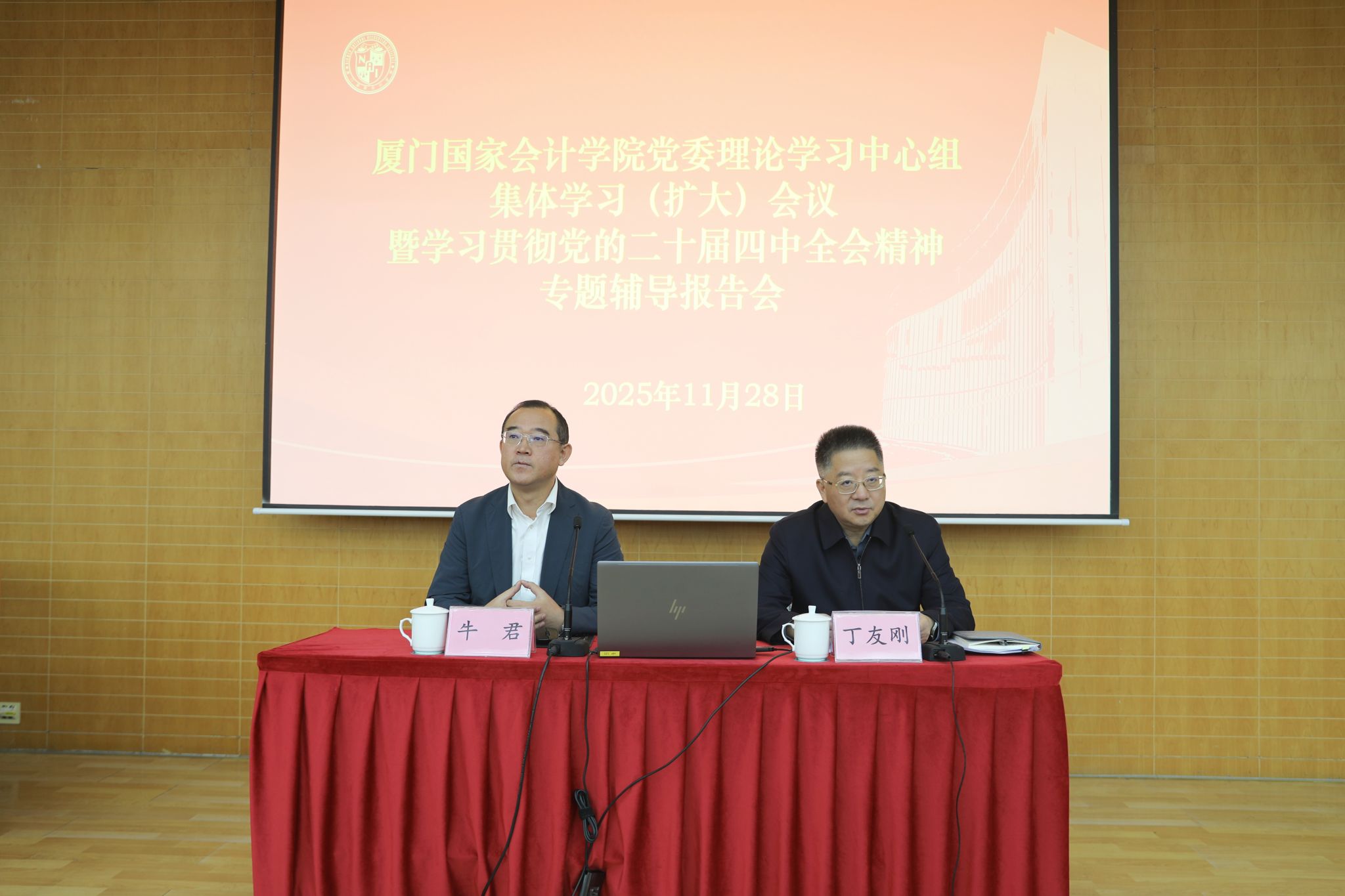 为深入学习贯彻党的二十届四中全会精神,引导广大党员、干部职工将思想和行动统一到全会精神上来,11月28日上午,厦门国家会计学院召开党委理论学习中心组集体学习(扩大)会议,邀请全会精神厦门市委宣讲团成员、市委党校副校长牛君教授作专题宣讲。学院党委副书记、院长丁友刚主持会议并讲话。学院党委领导班子成员和全院教职员工聆听了报告。