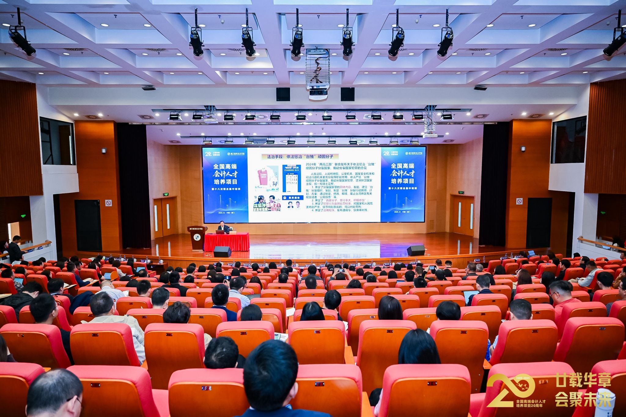 2025年12月2日,全国高端会计人才培养项目第十八次联合集中培训暨项目二十周年总结活动在厦门国家会计学院持续开展,专题讲座环节聚焦“新形势下的两岸融合发展与交流”主题,开拓学员视野、凝聚共识;主题研讨环节以“破茧·笃行·致远——全国高端会计人才成长之路”为主题,学员代表们结合实践经验交换见解,在思想交流中碰撞新思路。