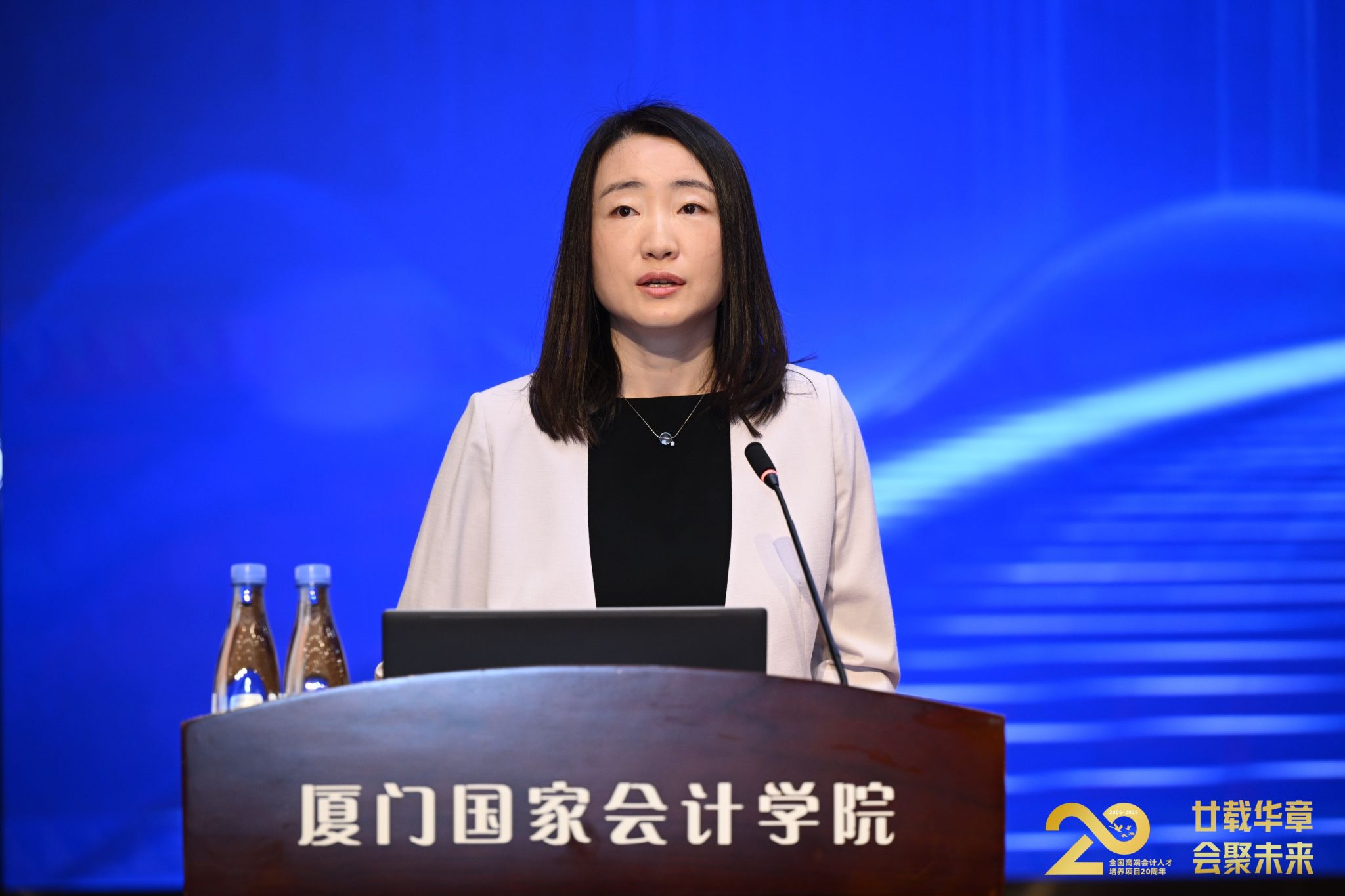 全国高端行政事业7期学员、国家机关事务管理局机关服务中心财务资产处处长张丽华围绕“何以领军”展开演讲。在多年的学习与实践中,她深刻体会到,高端会计人才不仅是专业高度的标杆,更是人格修养与行业情怀的相互照亮。她分享了从老师和同学们言传身教中学习到的优秀品质和良好习惯——在履职中处理好“主与次、大与小、我与他”的关系,不断提升政治能力、决策支持能力等核心素养,以实现从“专业尖兵”到“行业舵手”的跃升。同时,她积极践行培养项目“反哺”理念,在培养期间,她更主动走向行业讲台,参与政策研讨、西部送教,致力于将个人所学转化为推动行业进步的涓涓细流。她号召每位高端会计人才承担起共同的责任,让个人“微光”汇聚成照亮行业的“火炬”。