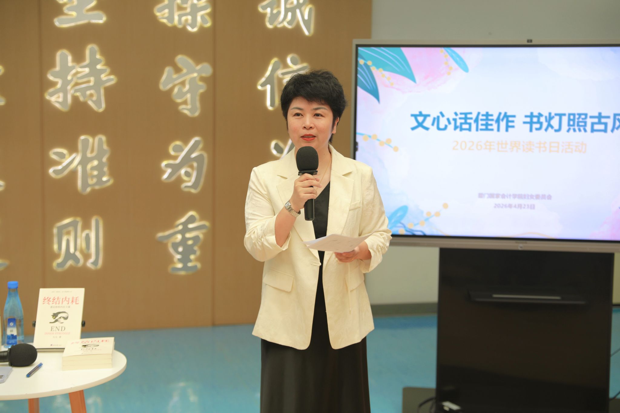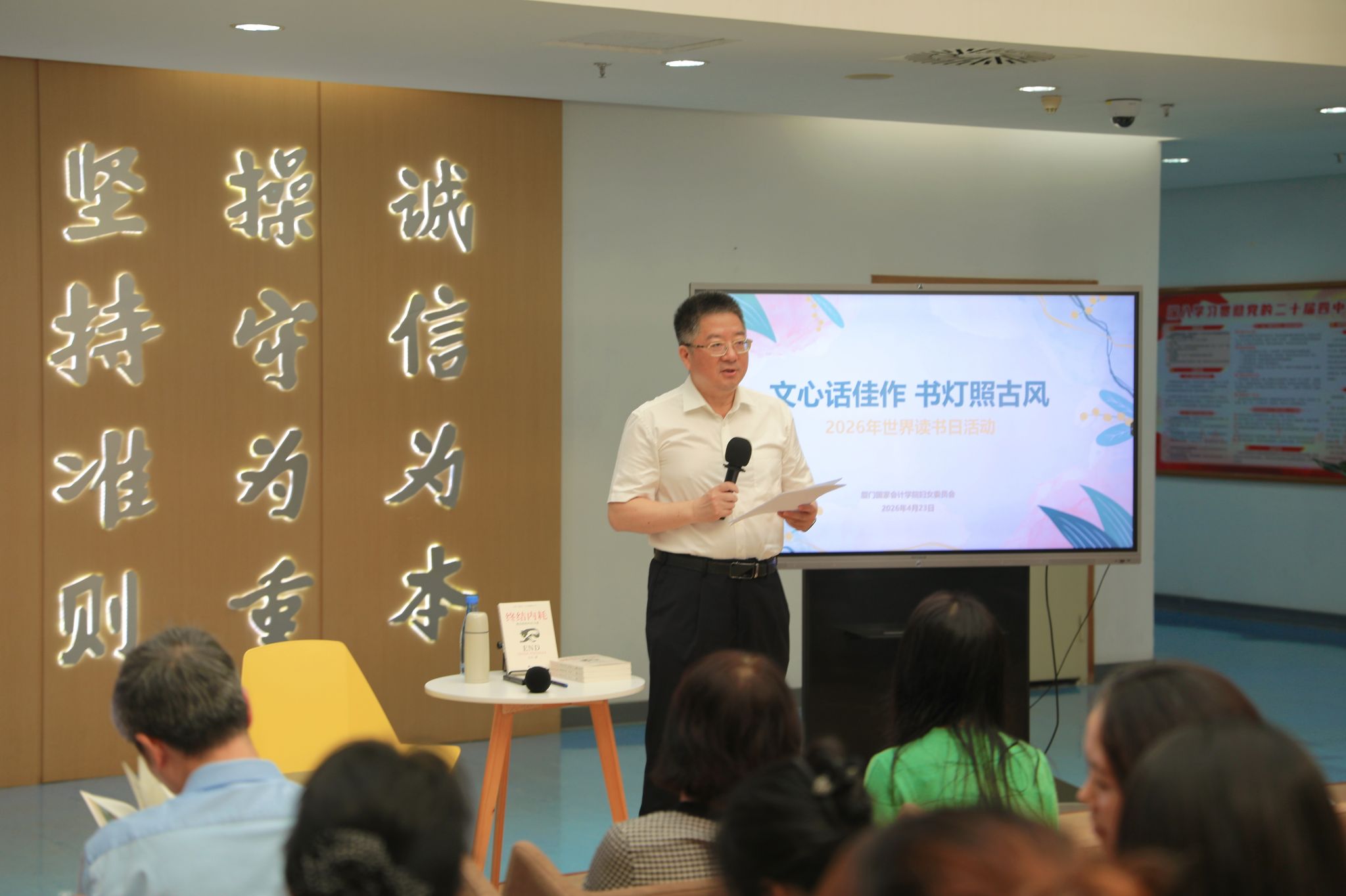 当第31个世界读书日与我国首个“全民阅读活动周”在2026年的春天相遇,一场关于知识与思想的盛宴在学院图书馆徐徐展开。4月23日,学院以“文心话佳作 书灯照古风”为主题开展读书日活动。活动由学院妇委会主办,新华书店协办,包含读书专题分享和古风书灯制作两个环节。学院党委副书记、院长丁友刚及众多师生共同参与,活动由学院妇委会主任万琼主持。