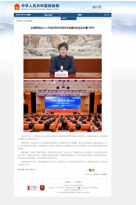2025年12月3日,全国高端会计人才培养项目20周年总结暨毕业活动在厦门国家会计学院举行。财政部党组成员、副部长郭婷婷以视频方式出席活动并讲话。