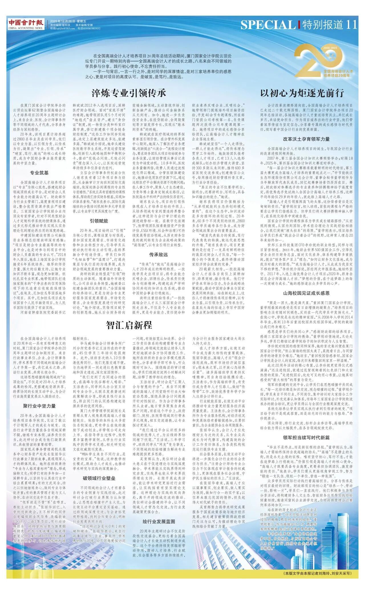 20 载薪火相传,一批批高端会计人才在各自岗位上深耕细作、跨界突破、接力传承。他们守护资本市场公信力,为企业战略决策赋能,推动中国财会事业与国家发展同频共振。站在新起点上,这些人才将继续传承项目精神,以专业为基、以引领为责、以传承为任,在星辰大海的征途上书写中国财会事业更加辉煌的明天。