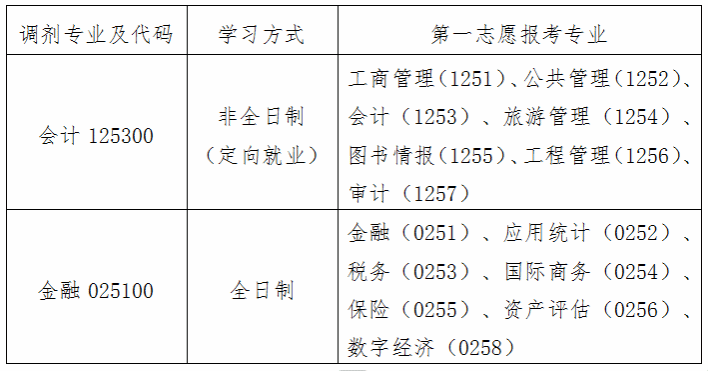 (三)申请调入会计专业(非全日制)、金融专业(全日制)的考生第一志愿报考专业范围如下: