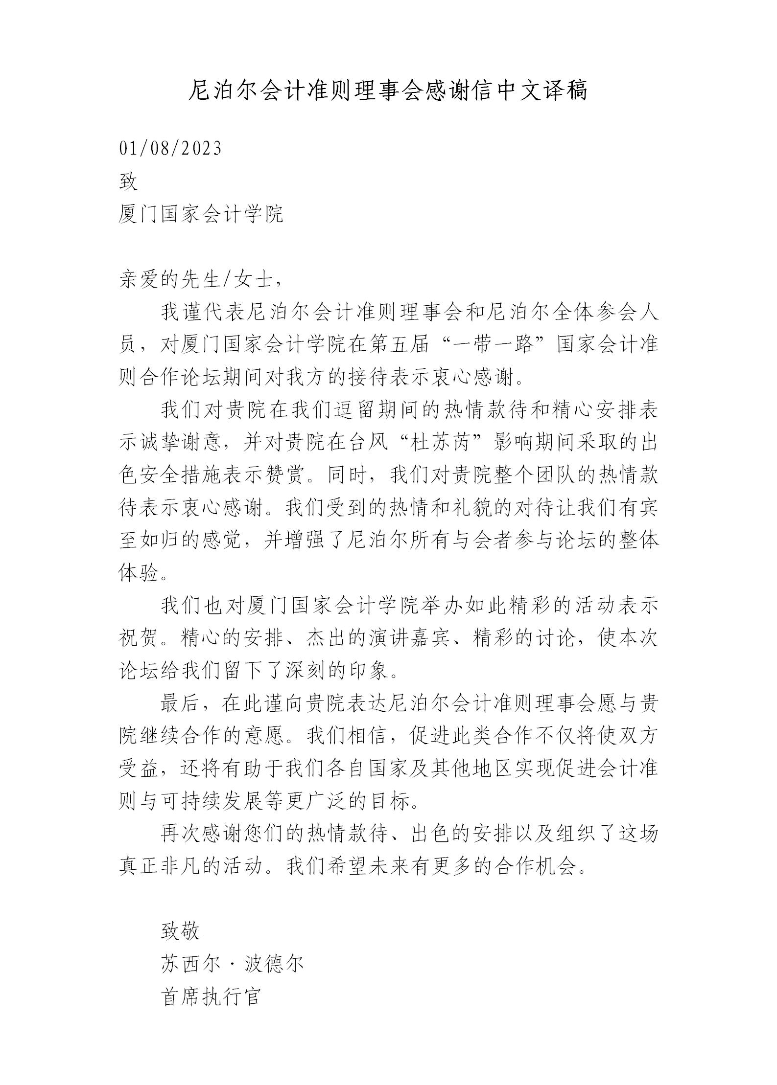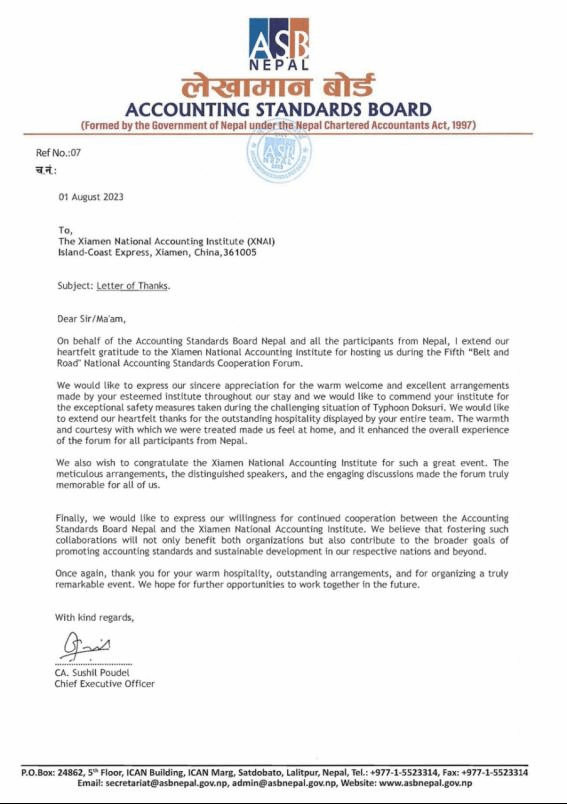 顺利返程后,尼泊尔参会代表向学院发来一封感谢信,感谢学院举办了这场精彩的论坛活动,赞赏了学院为应对台风“杜苏芮”采取的出色安全措施;学院对参会代表们的热情款待令他们产生了宾至如归的感觉;并表示,期待今后进一步增进双方合作。